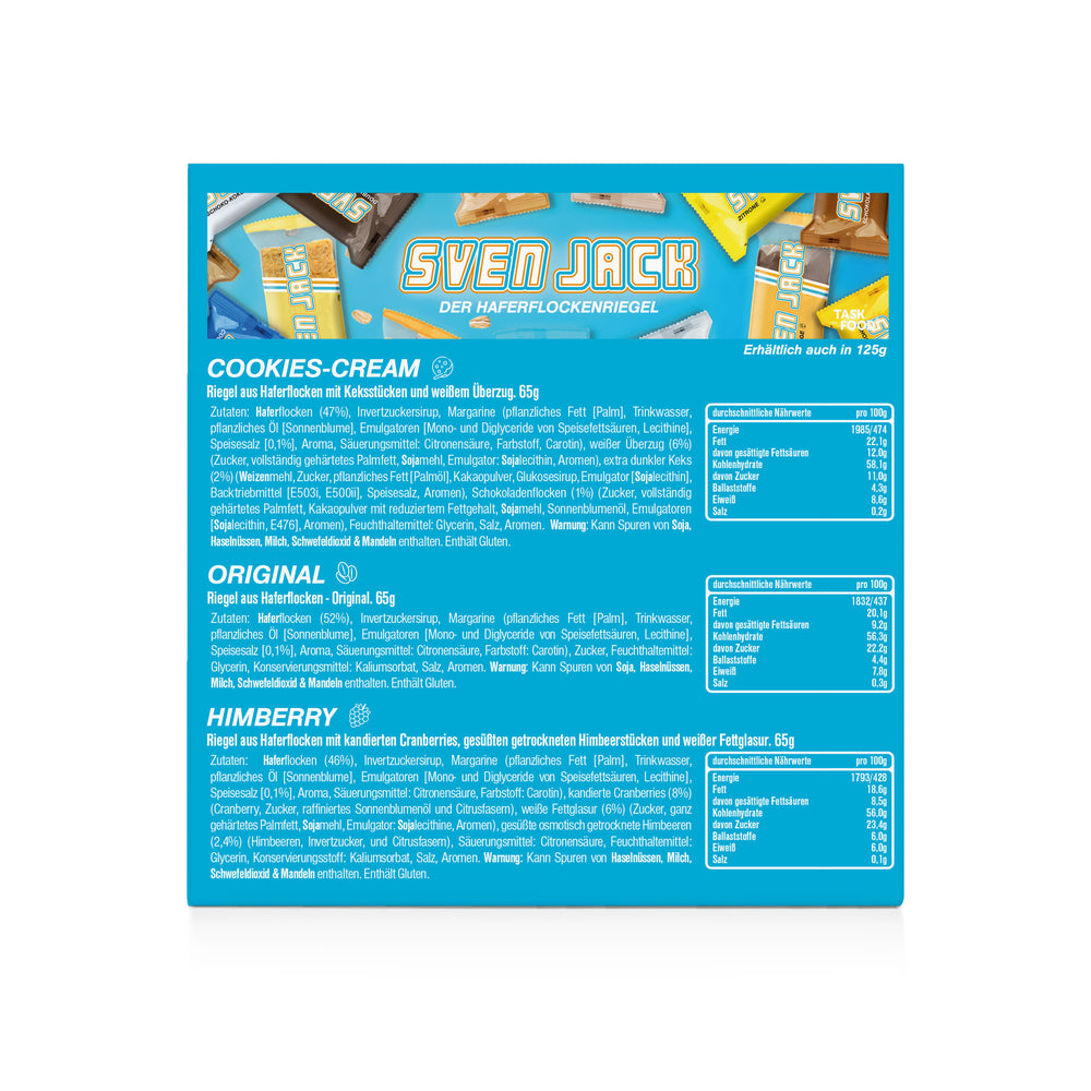 La boîte SvenJack 3x65g Fixbox est ton compagnon idéal pour les petites faims entre deux ou comme cadeau bien pensé pour les amis qui apprécient ce qui est spécial. Cette boîte soigneusement composée comprend trois barres irrésistibles dans les saveurs Original, Cookies & Cream et Framboise - une palette qui va du classique au créatif et qui ravira tous les palais. Chaque barre de 65g est un mélange exquis d'ingrédients de haute qualité, conçu pour maximiser à la fois la valeur nutritionnelle et le plaisir. Que ce soit comme source d'énergie rapide au quotidien ou comme petite attention pour un être cher : La Fixbox SvenJack est le choix idéal pour tous ceux qui recherchent le goût et la qualité dans un format pratique.