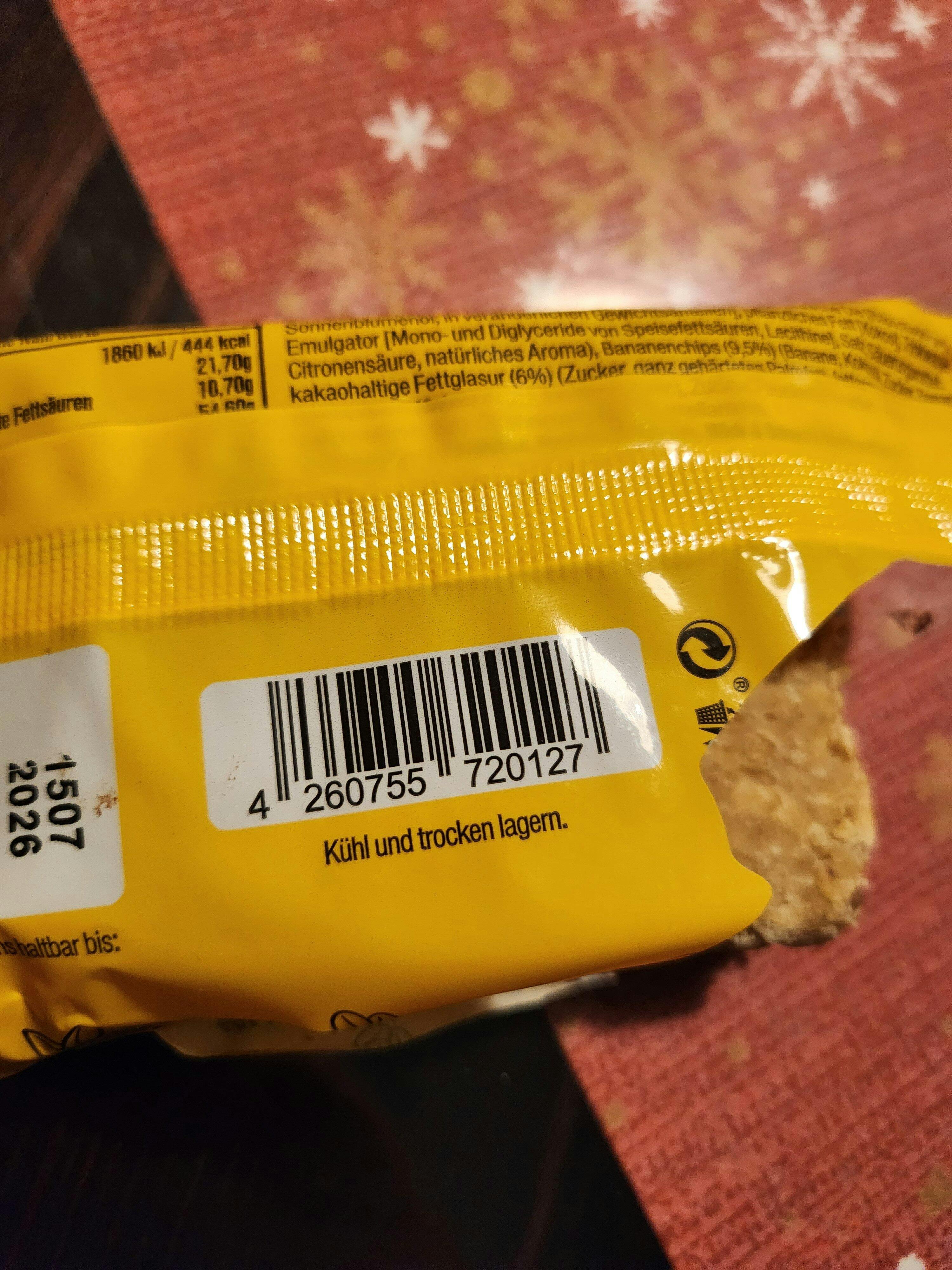Riegel aus Haferflocken mit Bananenchips & kakaohaltiger Fettglasur.